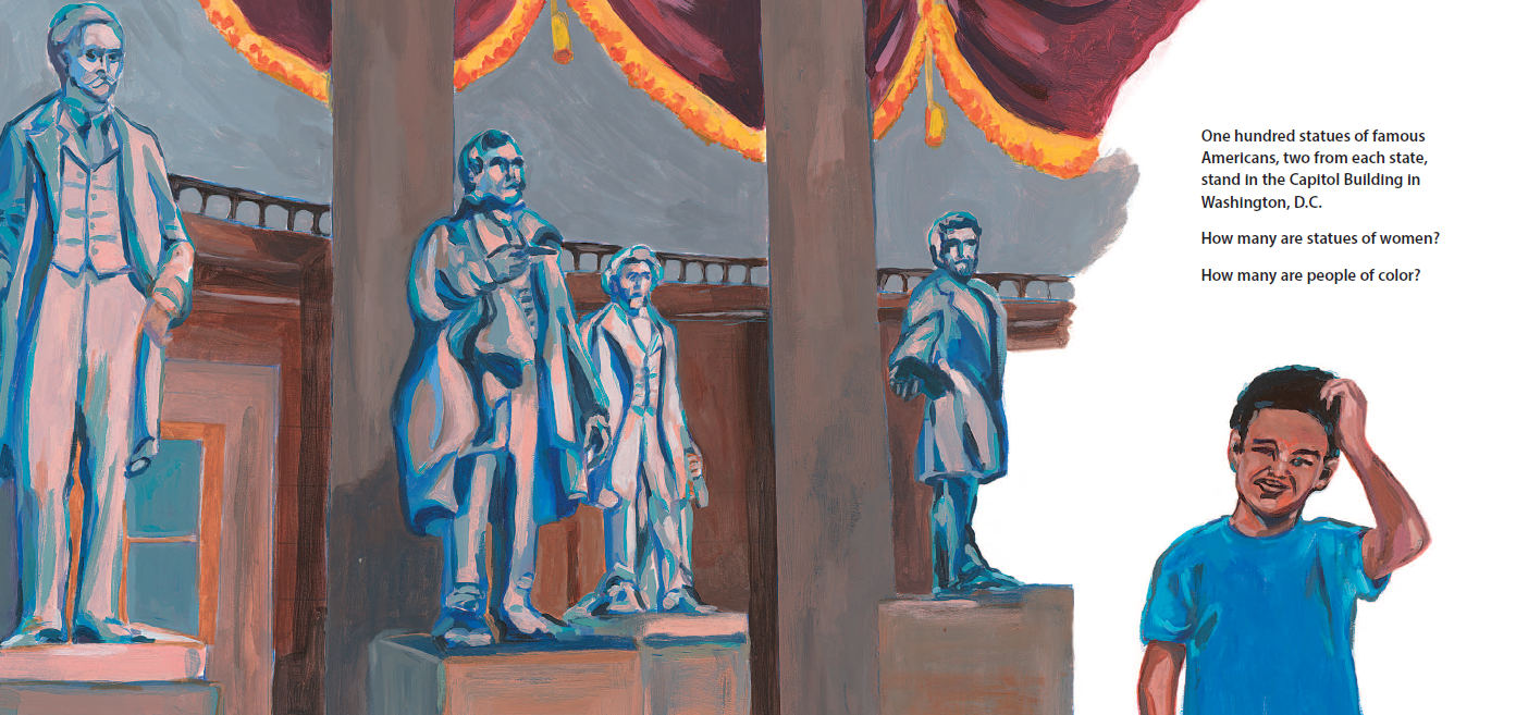 Near the beginning of “Who Needs a Statue?” is an illustration of a young African American boy next to statues of four illustrious-looking white Americans on pedestals in the Capitol. The boy has a question, as he frowns and puts a hand in his hair as if in thought: “How many are statues of women? How many are people of color?” Statues, after all, are meant to be representative, though the idea of representativeness keeps changing, which this book implies is the point of swapping out statutes.